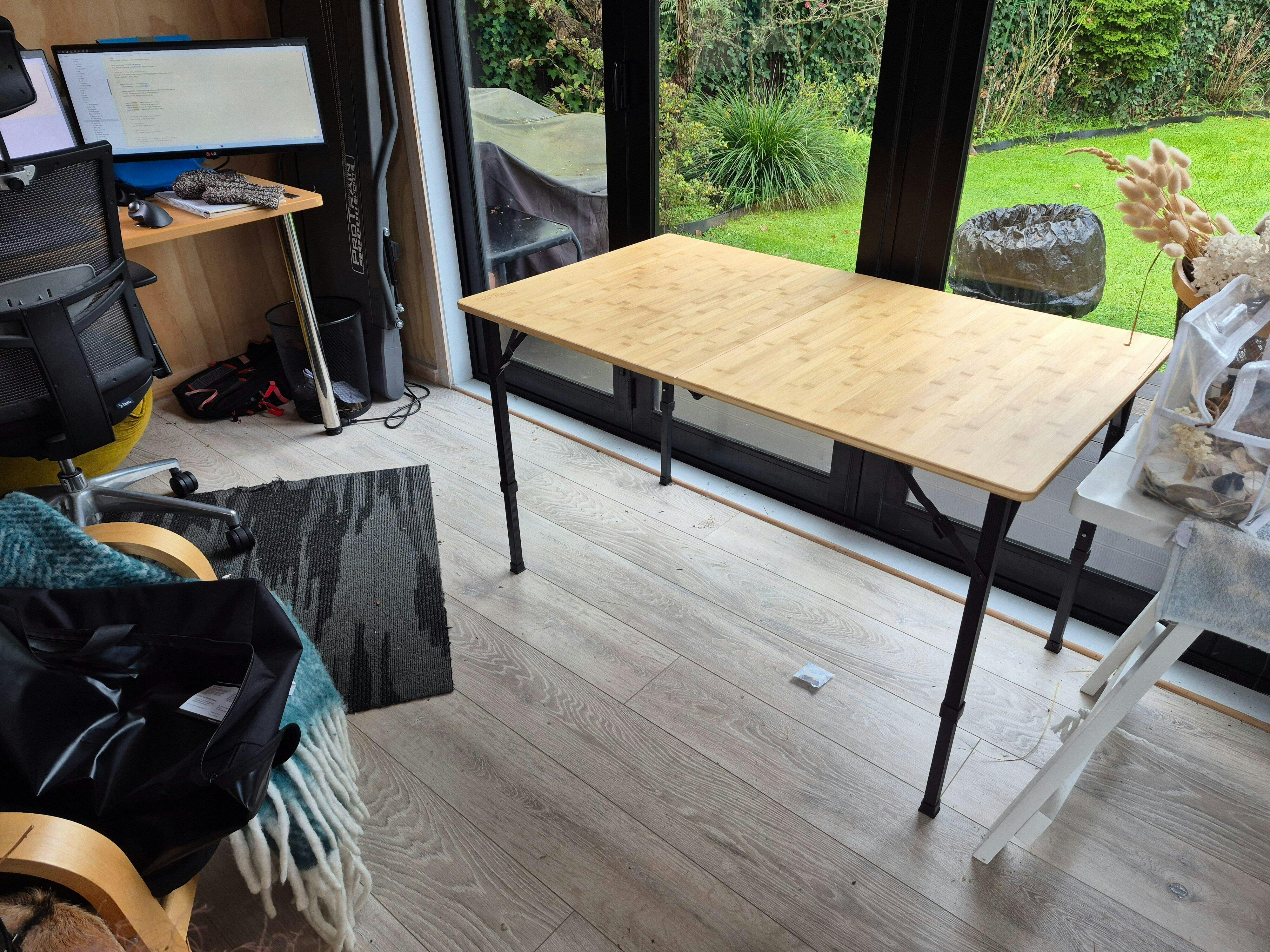 We bought this table to use as a craft table. It folds away easily and has a bag it can be stored in. The legs lock into place well and have three height levels. The highest level is standard desk height. The bamboo top looks nice with the back frame.