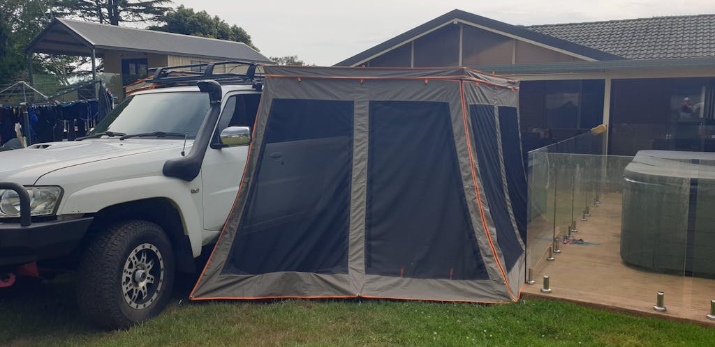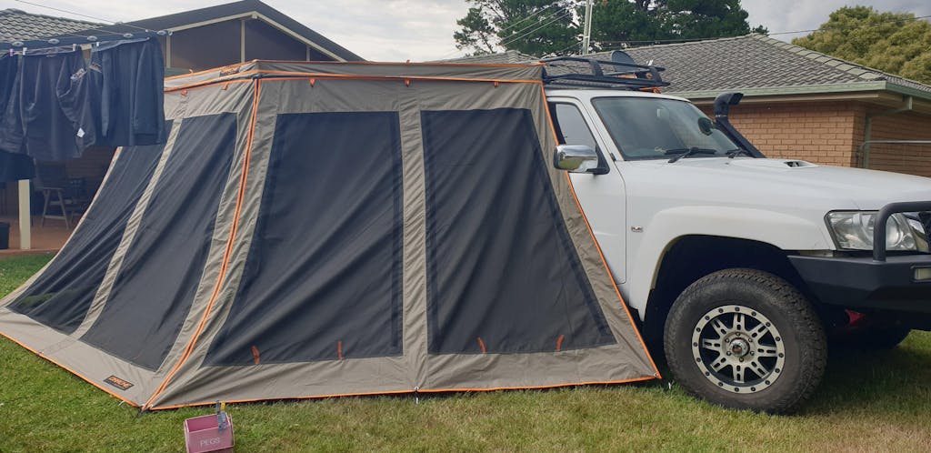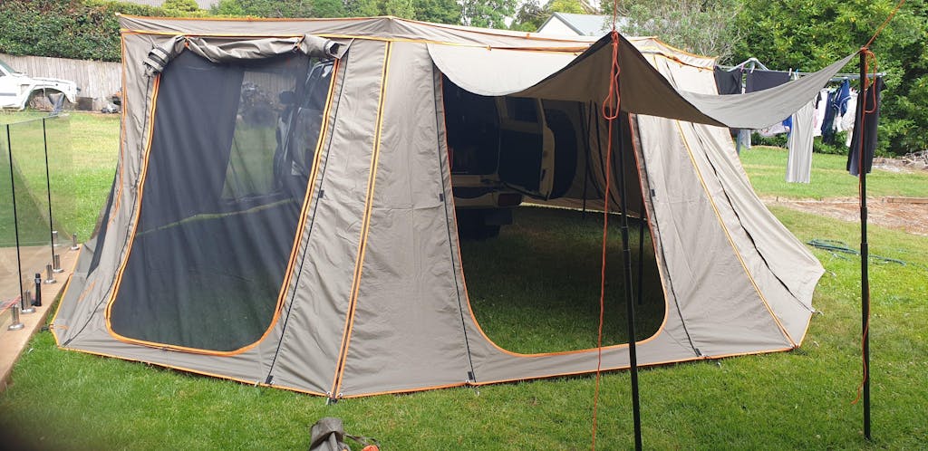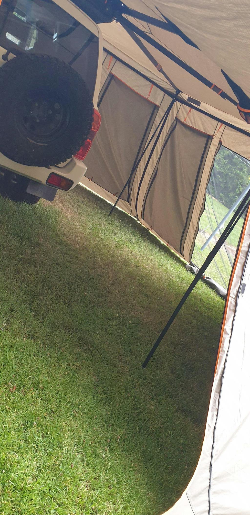 It mounts cleanly to almost any platform rack or rooftop tent up to 138 cm wide. Mounting brackets are included, along with roof top tent ladder brackets, guy ropes, pegs, and four integrated leg poles for when you need extra stability.
